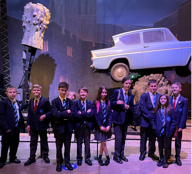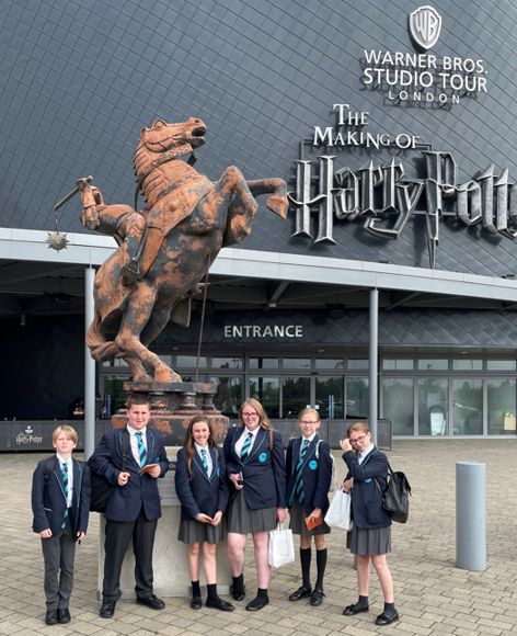 The English department had the great pleasure in taking 60 Year 7 students to Harry Potter World. Upon arrival, we were led through the corridors of the studio and up to a Harry Potter themed classroom. There were exhibits of original costumes, worn by the actors themselves! The students had a super lesson! They learnt how to pitch film ideas to potential investors at Warner Brothers using a range of persuasive devices.